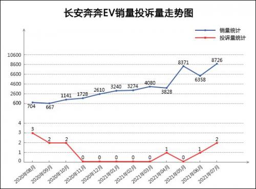 在五菱宏光MINIEV的带动下,国内微型纯电动汽车迎来新一轮发展,而长安奔奔EV(奔奔E-Star)也搭上了这班顺风车,成为2021年新能源市场上又一匹“黑马”。据最新数据显示,今年前7月长安奔奔EV累计销量37,877辆,力压奇瑞小蚂蚁和欧拉黑猫,暂列国内新能源微型车排行榜亚军。从其近一年来的销量投诉量走势图可以看到,长安奔奔EV的销量呈现出明显的走高趋势,7月份销量达8,726辆,创造了车型自发布以来的历史最高纪录。反观其月投诉表现,近一年来的月投诉量均保持在个位数,其中有半数的月份实现了“零投诉”,短期内的质量口碑值得肯定。随着国内新能源微型车市场发展持续火爆,奔奔EV也有望持续刷新自己的销量极限,说不定有朝一日也能登上“神坛”。