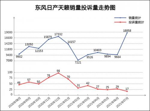 作为日系中型车“三剑客”之一,东风日产天籁自换代后销量表现并不尽如人意,与竞争对手雅阁和凯美瑞之间的差距逐步拉大。进入2021年,天籁的销量略有起色,7月份的销量更是创造了车型自发布以来的历史最高纪录,今年前7月的累计销量较去年同期上涨49.5%。更令人欣慰的是,从其近一年来的投诉量走势可以看出,天籁在进入2021年后,投诉量高企的情况得到缓解,投诉量下降趋势明显,7月份的投诉量更是降至近一年来的最低点,短期质量口碑表现逐步向好。整体来看,在度过了近半年的盘整期后,天籁已积攒了足够的上升势能,加之质量口碑呈现转好趋势,短期内销量将有望持续保持在高位。