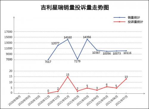 伴随着吉利星瑞的上市,吉利汽车也宣告迈入了“科技吉利4.0时代”。作为吉利CMA超级架构下的首款轿车,吉利星瑞被寄予厚望。就其上市后的市场表现来看,的确也对得起“颠覆者”的称号。不过,从其近一年来的销量走势来看,在经历了上市之初的销量大涨大跌后,星瑞在进入2021年销量日趋平稳,但似乎有些上升乏力,月销量始终保持在刚刚万辆出头的位置。反观其投诉量走势,呈现出震荡走高的态势,7月份的投诉量更是飙升至其上市以来的第二高点,环比大涨1.6倍。销量停滞不前的情况下,投诉量大涨,星瑞的质量口碑出现转差迹象,未来下半年的市场走势变得有些扑朔迷离。