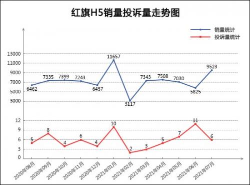近年来,自主品牌向上发展如火如荼,作为中国“国车”品牌的红旗同样开启了快速发展之路。据最新数据统计,今年1-7月红旗累计销售新车170,600台,同比增长95%。其中,作为自主品牌B级车领头羊的红旗H5贡献了不小的力量,占比超过了30%。从红旗H5近一年来的销量走势来看,除了在今年年初有些波折外,整体销量走势日趋平稳。7月份,红旗H5的销量再次有所突破,创造了近半年来的新高,环比上涨63.5%。结合其月投诉走势来看,红旗H5绝大部分的月投诉量均保持在个位数,整体质量口碑表现良好,7月份的投诉量冲高回落,与销量形成了“开口”走势。有消息称,红旗H5年度改款车型近期将正式上市,预计配置层面将进一步得到优化。综合来看,红旗H5在各个利好因素的推动下,短期内销量将有望持续攀升,能否再次破万,值得期待。