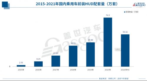 数据显示,自2016年开始,国内乘用车前装HUD装配量开始呈现持续攀升状态。2020年增速大幅提升,配套出货量累计达76.5万台套,同比增长超过100%。今年上半年,配套数据再度升级,达到了50.32万台套,市场渗透率提升至5%。