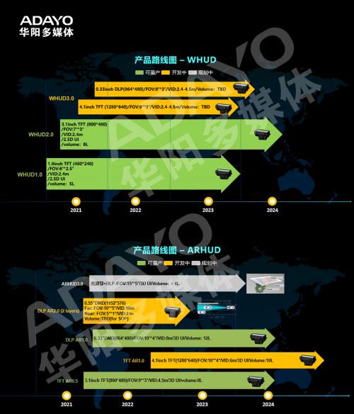 在技术研发层面,各大HUD供应商亦纷纷加码。日本精机、大陆等国际零部件巨头因起步较早,目前已进入量产阶段。国内供应商亦不甘落后,据了解,华阳基于DLP及TFT方案的AR-HUD将于今年四季度实现量产。