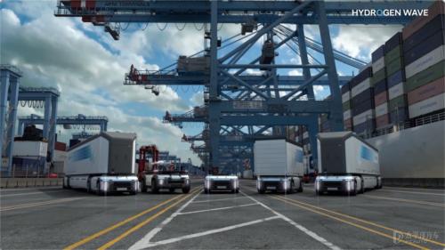 氢动智能无人运输车(Trailer Drone)作为全新概念车正式首秀,作为一种可实现完全自动驾驶的集装箱运输系统,其搭载氢燃料电池系统作为动力源,同时搭载两台智能无人运输平台e-Bogie。氢动智能无人运输车(Trailer Drone)根据行驶里程可量身配置储氢罐数量,从而确保一次充满氢气就拥有超过1,000km的续航里程,可完全媲美现有集装箱运输系统。