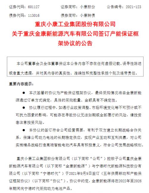 金康新能源与宁德时代签订《五年供需联动和产能保证框架协议》;小康股份公告截图