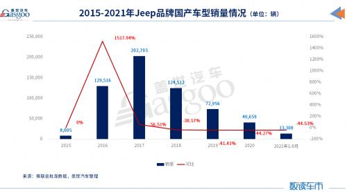 然而,好景不长,2018年,伴随国内乘用车市场下行,SUV市场内卷加剧,Jeep品牌在华走起了下坡路,这一年其国产车型销量仅为12.5万辆,同比下滑38.57%。近三年来,Jeep在华销量进一步下跌,去年销量不足5万辆,今年前7个月销量仅为1.3万辆。