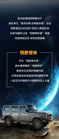 即日起,北京越野在悦野圈APP正式开启“使命召唤召唤使命者”征集行动,北京越野车主可登陆悦野圈APP报名参与,报名者中悦野值前30名用户将进入票选阶段,并最终争夺10个“悦野使命者”资格。获资格者将进入西昌卫星发射中心,参与使命召唤第8季行动全部环节,完成神秘任务,亲历盛况并分享给无缘到场的越野兄弟,共同见证使命荣耀时刻。