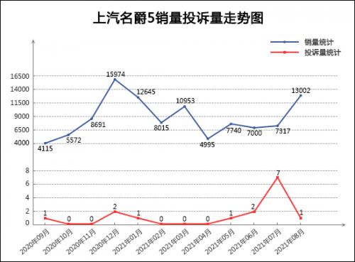 在2020年11月被成功“复活”后,凭借运动化的造型和更受国人喜爱的三厢车结构,名爵5的市场表现一路飘红,已成为上汽名爵最重要的销量担当。今年1-8月,名爵5累计销量71,667辆,稳居上汽名爵各车型之首,在上汽名爵同期总销量中的占比超过1/3。从其近一年来的销量投诉量走势图来看,在2020年12月销量冲顶后,名爵5经历了近半年的调整期,8月份销量时隔四个月再次冲破万辆大关,达到了近一年来的第二高点。反观其月投诉量,始终保持在个位数水平,近半数月份实现了“零投诉”,短期内的质量口碑值得肯定,望再接再厉。随着销量再次冲高,以及稳定的质量口碑表现,名爵5有望进入新一轮的销量增长周期。