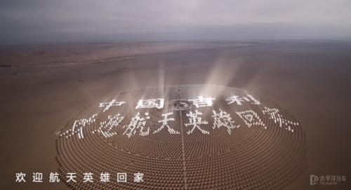 据悉,这两幅巨型标语是通过智能编程调转角度的方式,调动光热发电站超10000面定日镜组成特定的巨型文字图形,航天员即便身处数千米高空也能清晰看到镜面反射阳光拼组的内容。