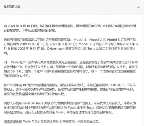 公告上表示,已有的引荐订单需满足以下条件方可获得引荐奖励: Model S、Model X和Model 3订单的下单订购日期为2019年10月1日至2021年9月17日;Model Y订单的下单订购日期为2020年6月9日至2021年9月17日。Cybertruck等其它车型以及Tesla认证二手车订单不参与引荐计划。里程额度将在引荐的车辆成功交付后1个月内发放到账户中,且发放后6个月过期,同一账号下的特斯拉车辆可共享充电额度。