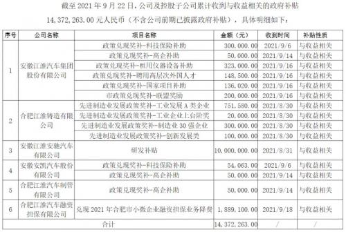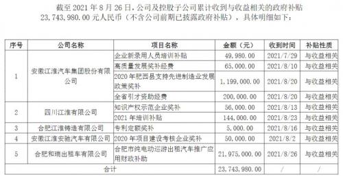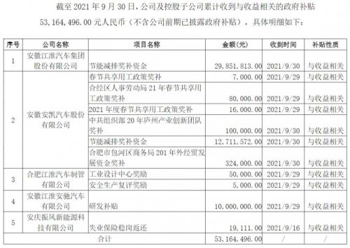 10月8日,江淮汽车发布公告称,截至2021年9月30日,公司及控股子公司累计收到与收益相关的政府补贴约53,164,496元人民币元人民币(不含公司前期已披露政府补贴)。江淮汽车在公告中指出,根据《企业会计准则第16号—政府补助》的相关规定,公司及控股子公司对上述补助资金在2021年度计入当期损益,将对公司2021年度的利润产生积极影响。
