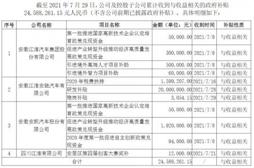 值得注意的是,今年第三季度,江淮汽车共发布了四次获得政府补助的公告,综合公告内容,除了上述政府补助之外,截至2021年9月22日,江淮汽车及控股子公司累计收到与收益相关的政府补贴14,372,263元人民币(不含公司前期已披露政府补贴);截至2021年8月26日,江淮汽车及控股子公司累计收到与收益相关的政府补贴23,743,980元人民币(不含公司前期已披露政府补贴);截至2021年7月29日,江淮汽车及控股子公司累计收到与收益相关的政府补贴24,588,261.15元人民币(不含公司前期已披露政府补贴)。