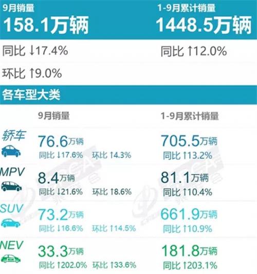 根据乘联会发布的最新数据显示,9月国内狭义乘用车销量为158.1万辆,与早前的7月和8月相比略有回升,然而因去年同期的对比基数为191.3万辆,是以同比跌幅仍继续扩大至达17.4%。