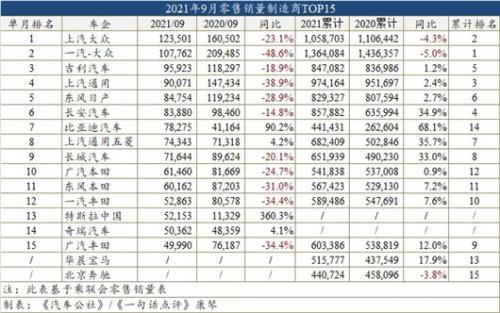 中汽协称,9月底芯片供应略有缓解,但数量仍不能满足生产。再加上生产和批发环节在前,改善的迹象要体现在零售市场尚需时日,因此9月国内汽车的零售销量并没有太大的起色。