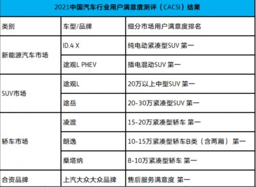 根据中国质量协会用户委员会10月12日公布的测评结果,上汽大众大众品牌各细分市场收获颇丰,ID.4 X、途观LPHEV、途观L、途岳、朗逸、凌渡、桑塔纳均荣登用户满意度榜首,售后服务亦取得合资品牌第一。