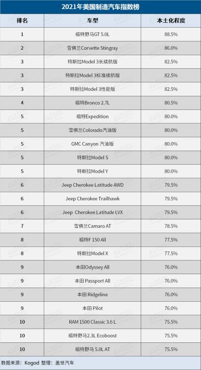 福特野马(Mustang)5.0升GT在2021年度美国制造汽车指数(America Auto Index)中登顶。该指数是衡量美国产汽车的本土化程度。