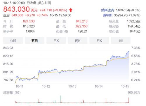 截至美国当地时间10月15日收盘,特斯拉股价每股报收843.030美元,涨幅达到3.02%,总市值也来到8445亿美元。与此同时,进入10月以来,从阶段性K线来看,也成功维持连续的增势。