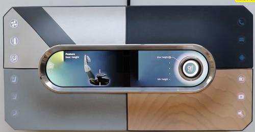 说完设计,那我们到底有哪些实物可以实现这些功能呢?佛吉亚拥有各类沉浸式显示屏,比如说旋转式显示屏,滑动显示屏,无边框显示屏,各种异形屏等等,显示屏会在交互里面扮演非常重要的作用。除此以外,大家一定会好奇佛吉亚智能座舱的创新到底还有什么特点呢?当然有,接下来跟大家介绍一下,我们做的这个Demo是什么。大家平常会倾向于通过大屏来进行操作,不过因为大屏和驾驶员会有一些距离,驾驶时进行操作的话会有一些危险,那么我们就在考虑可以取代大屏的方案。可以看到这个图的中间有个很小的屏幕,而屏幕的右侧有一个智能旋纽可以控制屏幕上的功能,同时在四周我们还设置了四种不同材料的智能表面,可以通过这三者间的联动来实现以前只有大屏才能实现的操作,大家可以看一下。