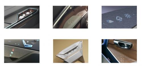 刚刚讲到智能表面在智能座舱中会扮演非常重要的角色,这里给各位展示的是各类具体的应用方案,比如左上角是3D造型智能表面方案,完全可以用来打造个性化体验。同时,在门板上还有木质的,皮质的,织物的智能表面,以及我们最新开发的融合了轻奢感和科技感的水晶智能表面。