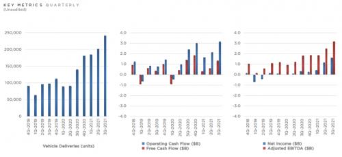 基于比较好的交付业绩,特斯拉第三季度财务表现也十分突出。其中,季度营收同比上涨57%至137.57亿美元;毛利润为36.6亿美元,同比涨幅为77%;调整后息税前利润为32.3亿美元,同比上涨77%;归属于普通股股东的净利润为(GAAP)为16.18亿美元,同比飙升389%;归属于普通股股东的每股收益为1.44美元,同比涨幅为433%;自由现金流为13.28亿美元,同比下跌5%。
