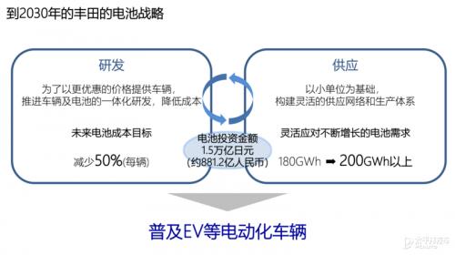 首先从丰田到2030年的电池战略来看,主要分为电池的研发和供应两部分。从研发来看,为了能够进一步降低车辆的价格,以及推进车辆及电池的一体化研发,就必须从降低研发和制造成本做起,预计实现每辆车的电池成本降低50%。