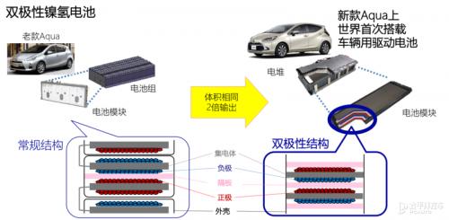 在镍氢电池上的发展,丰田将推出「双极性」结构的镍氢电池,并首次搭载在新款AQUA车型上。首先于老款AQUA车型的镍氢电池相比,在体积相同的条件下,电池的输出功率约为之前的两倍,并且使车辆的加速性能更加的线性。