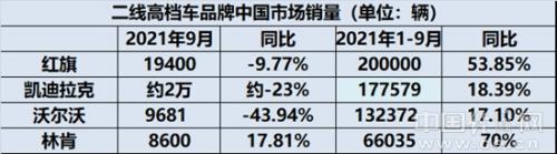 聚焦9月二线高档车市,虽然整体竞争格局未发生改变,但多个品牌销量均出现不同程度下滑。其中,红旗销量19400辆,同比下滑9.77%;凯迪拉克方面没有公布销量,根据通用汽车三季度销量数据计算,凯迪拉克9月约卖出2万辆新车,同比降幅在23%左右;沃尔沃较去年同期17270辆的成绩,陡降43.94%。值得一提的是,林肯品牌表现亮眼,逆势实现17.81%的同比正增长。
