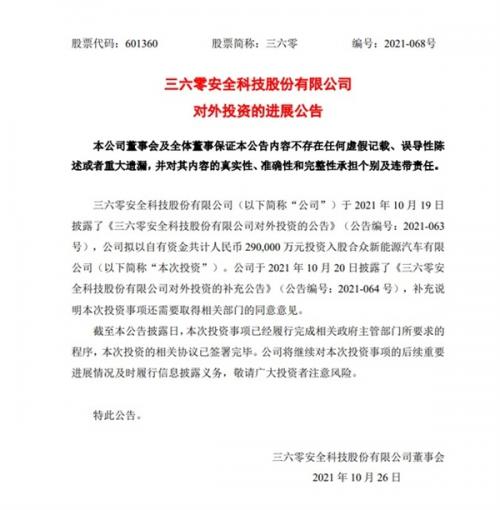 公告中指出,三六零此前披露拟以自有资金共计人民币29亿元,投资入股合众新能源汽车有限公司,目前已经履行完成相关政府主管部门所要求的程序,本次投资的相关协议已签署完毕。