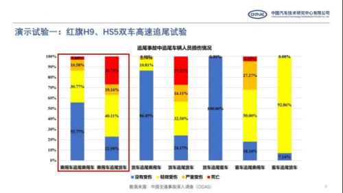 现实生活中,此类追尾事故极易造成重大人员伤亡。中国交通事故深入调查(CIDAS)数据显示,乘用车间追尾造成的人员死亡率为2.88%,而乘用车追尾货车的情况下,发生伤亡情况的比例高达77.01%,死亡率高达26.74%。并且,根据实际调查与分析数据,乘用车追尾货车事故相对速度低于50km/h的占比在60%以上。在相关国标要求中,碰撞台车的测试质量为1100Kg,碰撞速度为32kph,而在本次双车高速追尾试验中,作为碰撞台车的红旗H9试验质量达到了2152kg,速度为50kph,碰撞总能量相当于国家标准的4.77倍,远高于国标要求,测试条件极为苛刻。