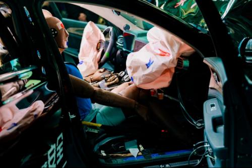 除了全方位的车身防护,高效严密的乘员防护在本次碰撞测试中功不可没。全车八安全气囊在发生碰撞后均迅速点爆,在与车内假人发生接触时均已完全处在完全充气状态,结合车内的双级限力安全带,分阶段智能施加约束力,有效地降低了车内驾乘人员伤害。