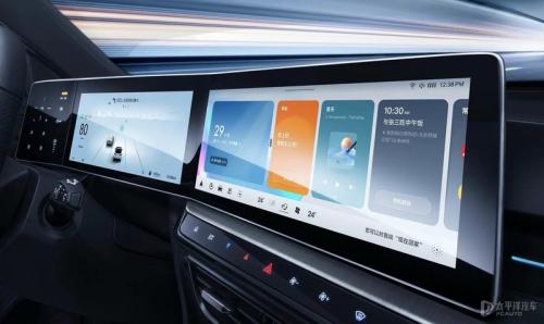 内饰方面,新车还是能对的起“智潮科技”SUV的名号的。可以看到新车的内饰最吸引眼球的莫过于中控台上方的“三联屏”,每一块屏幕之间还存在一定夹角,对驾驶席呈环抱的姿态。另外,可以看到空调控制区域和灯光控制区域也取消了实体按键的设计,整体风格简洁而不失科技感。