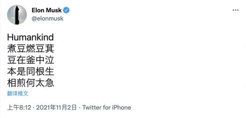 北京时间11月2日早上8点,美国时间11月1日晚上8点,特斯拉CEO埃隆*马斯克(Elon Musk)在推特上发了一条“朋友圈”,内容竟然是一首著名的《七步诗》。