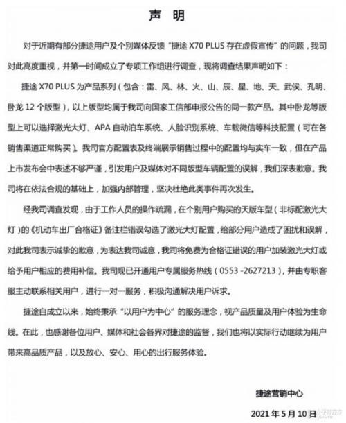 5月10日,奇瑞旗下捷途品牌针对捷途X70 PLUS(询底价|查参配)车型的虚假宣传问题发布声明。将免费为涉事用户给予相应的费用补偿。以下为公告原文。