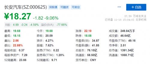 2021年11月15日晚,阿维塔科技携首款车型在上海发布亮相。作为长安汽车携手华为和宁德时代打造的全新高端品牌,阿维塔科技自诞生之日起,一举一动都备受关注。然而,11月16日A股开盘后,长安汽车的股价却一路下跌,最大跌幅达到了9.41%,最终报收18.27元,下跌9.06%。