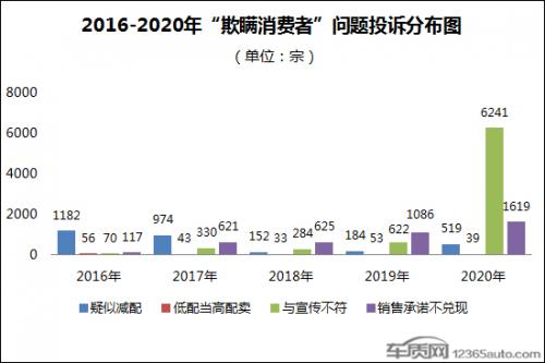 如果说因为芯片短缺所导致的配置取消和延迟补装问题只是冰山一角,那么普遍存在的欺瞒消费行为才真正令人发指。据车质网数据显示,“销售承诺不兑现”、“与宣传不符”、“低配当高配卖”、“疑似减配”四类问题在所有欺瞒消费行为中占比较高。从2016-2020年的投诉情况来看,“销售承诺不兑现”和“与宣传不符”两大问题的投诉量整体呈上涨态势,其中“与宣传不符”问题投诉量更是在2020年达到6241宗,远超其他问题投诉量。而“低配当高配卖”问题投诉量相对稳定,相比之下,“疑似减配”问题投诉量波动较大,与个别车型投诉量集中爆发有一定关系。