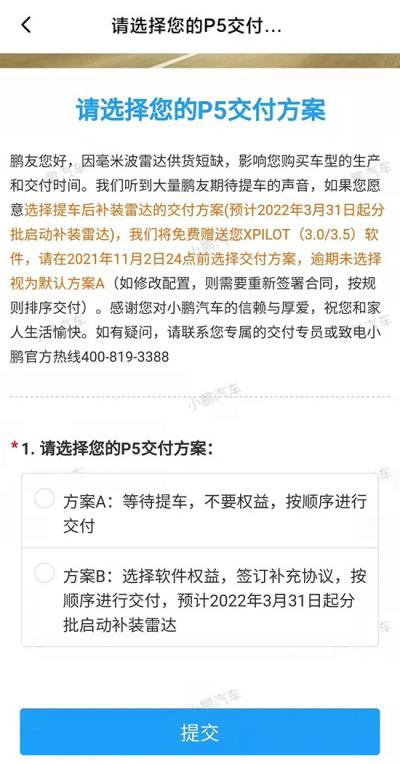 相比特斯拉在车主毫不知情的情况下直接取消相应配置,理想和小鹏的做法似乎更加妥当。理想汽车早在今年10月初便发布了“先交付后补装雷达”的交付方案,即10月-11月交付的车主可选择先交付三雷达版本车型,随后补齐另外两个雷达,同时理想汽车还承诺将为选择该方案的车主提供终身质保和1万理想积分补偿。而小鹏汽车也在随后的10月底推出了类似的交付方案,只要车主选择2022年3月31日起分批次补装雷达的方案,将可以免费获得价值上万元的XPILOT(3.0/3.5)软件服务。面对看似合理的交付方案,一些车主仍然表示自己并未收到官方推送的交付方案信息,因此交付被搁置和无限期延后。
