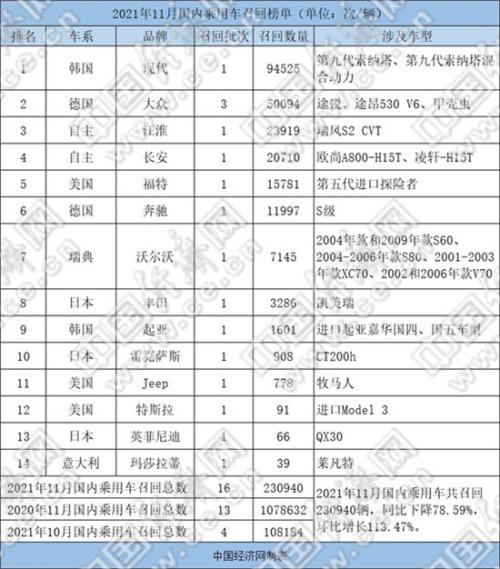 根据国家市场监督管理总局缺陷产品管理中心11月发布的召回公告,中国经济网汽车部经过汇总、统计,整理出“2021年11月国内乘用车召回榜单”。11月,国内车市共有14个品牌累计发布16起公告,共计召回乘用车230940辆,同比下降78.59%,环比增长113.47%。