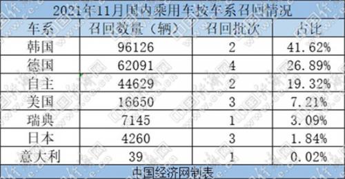 从车系划分来看,11月,现代、起亚两品牌共召回96126辆乘用车,推升韩系车召回量占总量的41.62%,领跑榜单。其中,现代一举召回94525辆第九代索纳塔和第九代索纳塔混合动力汽车,成为本月数量最大的单起召回。