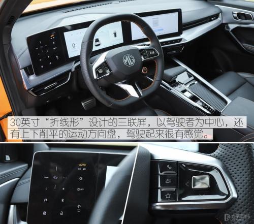 这个内饰完全没有过去的影子,保持运动范的同时,科技感直接拉满。比如达到了30英寸呈“折线形”的三联屏设计,每一块屏幕之间还存在一定夹角,对驾驶席呈环抱的姿态。空调控制区域和灯光控制区域也取消了实体按键的设计。整体不乱,设计感拉满,呈现出另外一种的智能座舱的科技范。