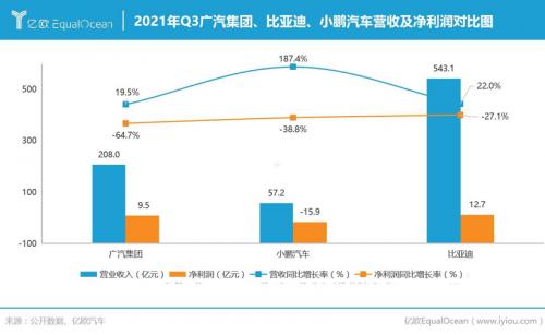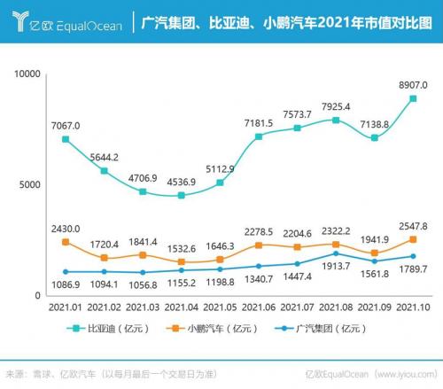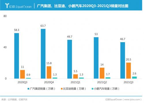 比亚迪在左,小鹏在右,广汽显然已经吊车尾。
