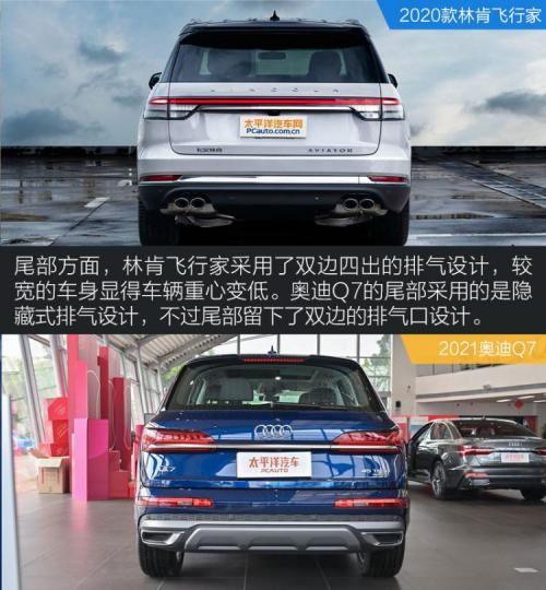 在尾灯设计方面,两者难得地达成了相同的意见,都采用了贯穿式的设计,不过林肯飞行家采用的是一体贯穿式LED尾灯设计,刹车时尾部的灯会亮起一条完整的线条,夜间的辨识度十分突出。奥迪Q7的贯穿式设计则是通过尾部的镀铬装饰达成的,中间并不会亮起。