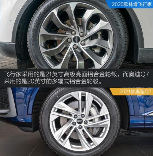 在轮胎尺寸方面,林肯飞行家采用的是21英寸高级亮面铝合金轮毂,前后轮规格均为275/45 R21。奥迪Q7采用的是20英寸5辐涡轮造型铝合金轮毂,前后轮胎的规格为285/40 R20。