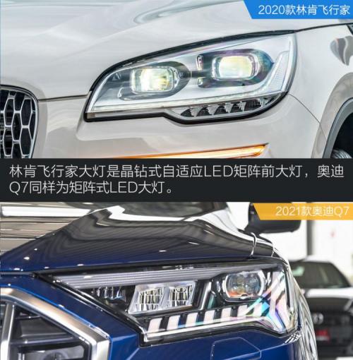 林肯飞行家和奥迪Q7的大灯都是LED矩阵式大灯,林肯飞行家的LED大灯带有前大灯随动转向、低速及弯道补光,奥迪Q7的LED大灯不带有低速及弯道补光的功能,不过可以加一万块选装激光大灯。