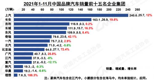 1-11月,汽车销量排名前十的企业集团中,只有北汽集团未能实现增长。与2020年同期相比,比亚迪增速最高,达到了72.4%,其次是奇瑞的42.1%,以及广汽集团的25.8%。