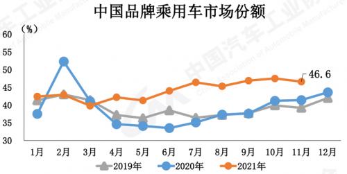乘用车市场11月销量为219.2万辆,环比增长9.2%,同比下降4.7%。其中,中国品牌乘用车销量为102.2万辆,环比增长7.3%,同比增长7.2%,占乘用车销售总量的比重为46.6%,占有率较上月下降0.8个百分点,比2020年同期提升5.2个百分点。