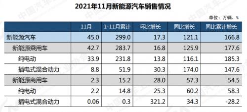 11月,新能源汽车市场共售出45.0万辆新车,环比增长17.3%,同比增长121.1%,市场渗透率达到17.8%,新能源乘用车市场渗透率为19.5%。其中,纯电动汽车销量为36.1万辆,同比增长1.1倍;插电式混合动力汽车销量为8.9万辆,同比增长1.7倍。