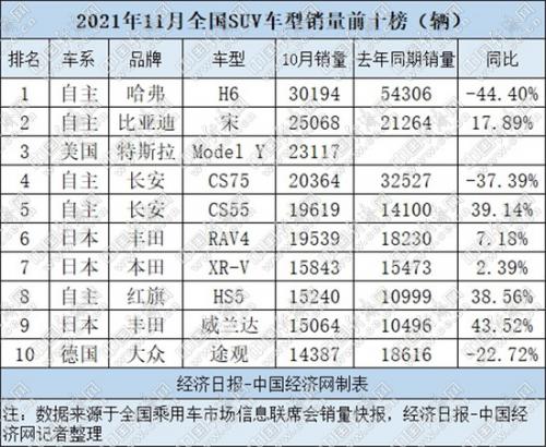 聚焦具体车型表现,哈弗H6和比亚迪宋连续第二个月包揽冠亚军,但表现不尽相同。其中,“王者”哈弗H6虽以30194辆的成绩再夺月度销冠,但44.40%的同比下滑同样“领跌”榜单,这已是其连续第二个月收获如此尴尬的“双冠”。哈弗H6的影响力大不如前,除了市场竞争加剧外,长城旗下“五花八门”的产品或也分散了哈弗H6的锋芒。