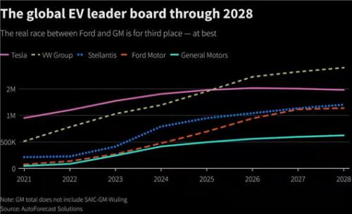 AutoForecast Solutions提供的数据,尽管这两家底特律制造商已经为转型做好了多维度的肉搏战准备,但截至2028年,其电动车生产依落后于领导者特斯拉和大众,不仅如此,他们还将直面Stellantis的竞争。