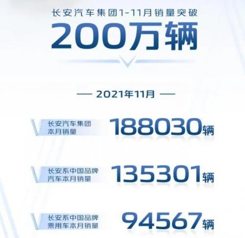 12月9日,长安汽车对外发布了最新销量数据。在11月销售188030辆新车后,长安汽车今年1—11月的整体销量已达到2122511辆,同比增长17.7%。在整体销量突破200万辆大关的同时,长安汽车在2021年前11个月的销量综合已超越去年全年。