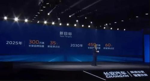 在新战略中,长安汽车明确提出到2025年,品牌年销量计划达到300万辆,其中新能源占比35%;到2030年,成为世界级品牌,销量将达到450万辆,新能源占比60%,海外销量占比30%。