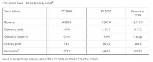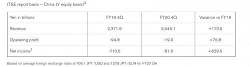 其中第四财季,日产汽车营收为2.545万亿日元,较2019年第四财季增加1735亿日元;运营亏损190亿日元,与2019财年同期相比,亏损显著减少;净亏损810亿日元,同比也有显著改善。